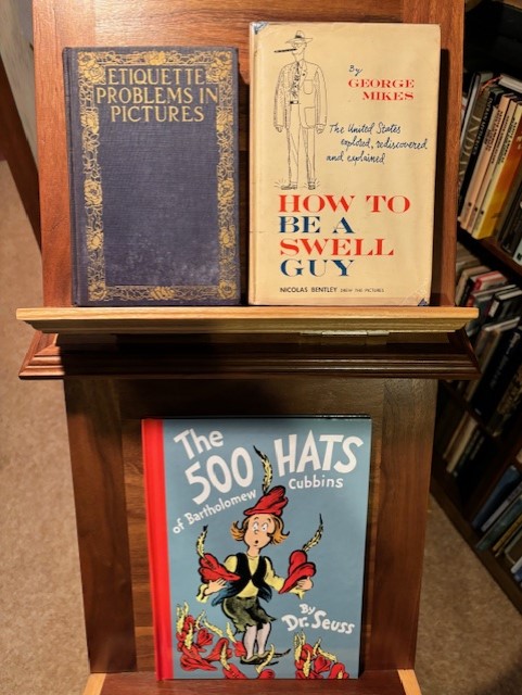 Today is National Hat day. I have several books on display for the occasion. The first is “How To Be a Swell Guy” by George Mikes, 1959. I like the title. It is an interesting book based on an Englishman’s views of first visit to the United States. I also like the picture of the cigar smoking bloke with a fedora.