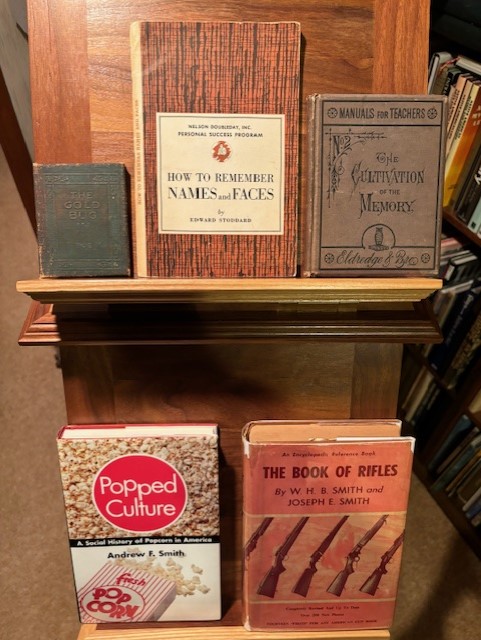 Three unusual days today, and four books to showcase them. Today is Good Memory Day, National Popcorn Day, and Gun Appreciation Day. It is also Edgar Allen Poe’s birthday, and I have a nice book from him. First, Happy Birthday to Edgar Allen Poe. He was born January 19, 1809. The book shown is “The Gold Bug” by Edgar Allen Poe, c1920, by Little Leather Library. It is 3 inches by 3 3/4 inches. It is a nice little detective story, and has a cryptogram to decipher.