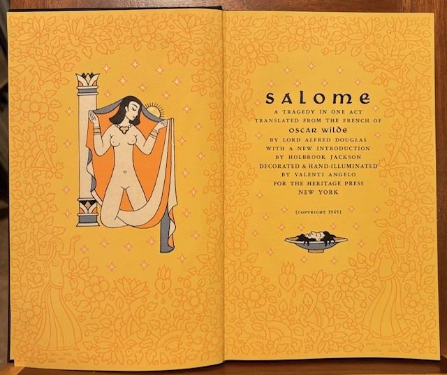 International Dance of the Seven Veils commemorates the death of John the Baptist. King Herod’s niece danced for him, and promised her anything. She asked for the head of John the Baptist. It was not called the dance of the seven veils until a play by Oscar Wilde was translated into English back in 1993. I have “Salome” by Oscar Wilde, Heritage Press, 1945. It is a striking book, in slipcase. The illustrations are tipped in gold. In this illustration, Salome’s necklace and bracelets, tips of piller, sun, and rim of the plate holding the head of John the Baptist are tipped in gold leaf.