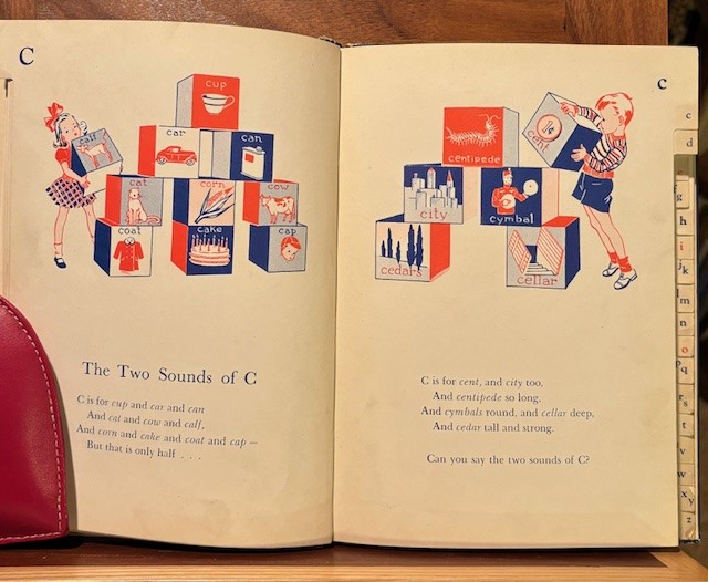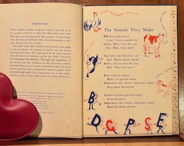 The book “Sounds The Letters Make” by Lucille D. Schoolfield, and Josephine B. Timberlake, 1940, has our theme in the title-“sounds”. You have to hear sounds. This book is about teaching the alphabet. The authors state in the forward, that children recognise a dog by his bark…they need to associate letters to their sounds”.