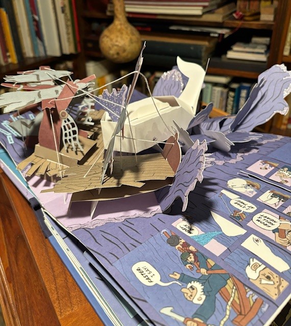 This brings us to “Moby Dick, a Pop-up” by Sam Ita, 2007. This is a wonderful adaptation of Moby Dick, written in a graphic novel style, along with Pop-ups. Sam Ita was commissioned to write four graphic novels/pop-up books based on famous novels. The other three were “Frankenstein, “The Odyssey”, and “20,000 Leagues Under the Sea”.