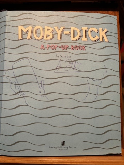 My mother and I went to see Sam Ita speak at a Pop-up convention in Philadelphia, a few years ago. After his talk about the writing of Frankenstein, we went up to talk with him personally, and chatted for about 20 minutes. He loved that my mom was a pop-up fan, and that we collected books together. After signing the three books she had, he asked why we did not have Moby Dick? Mom told him we were going that afternoon to the convention booksale to buy the fourth. He said “not today” and reached down to his briefcase. He pulled out the book, drew a picture of a whale in it, and gave it to her with a hug. Mom was more than just thrilled; and it was a real special moment for me, knowing I brought my mom to this weekend long convention for fellow pop-up book collectors and writers.