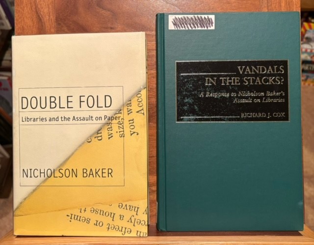 “Double Fold, Libraries and the Assault on Paper” by Nicholson Baker, 2001. This is an interesting book about putting records on microfiche, and film, and destroying hard copies of paper, especially newspapers in libraries, due to space and decomposition of paper. Nicholson is very passionate about the conspiracy throughout libraries. It is a riveting book.