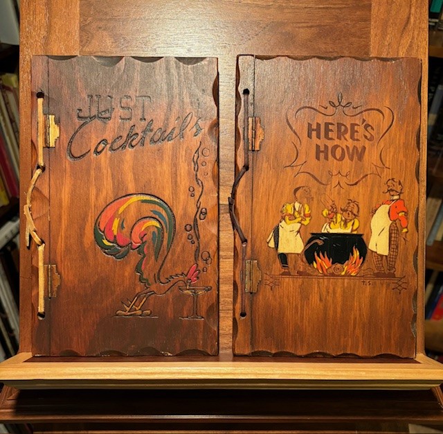 Not only are both of these books well written and exhaustive in number of drink instructions, they are beautiful books in their own right. The covers are made of wood, and the lettering burned in and then painted. You can see in the pictures, hinges and leather cord to hold the pages in.
