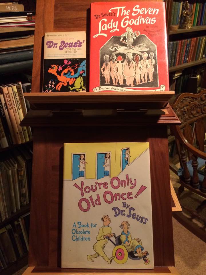 As well as the dozen or so of childrens Dr Seuss books in the kids section of my library, these are a few other interesting books I have. Dr Seuss’ “Lost World Revisited”, paperback 1967; “The Seven Lady Godivas”, an interesting take on the Lady Godiva tale; and “You’re Only Old Once”, where Dr Seuss ensures you are “properly pilled” and “properly billed”.