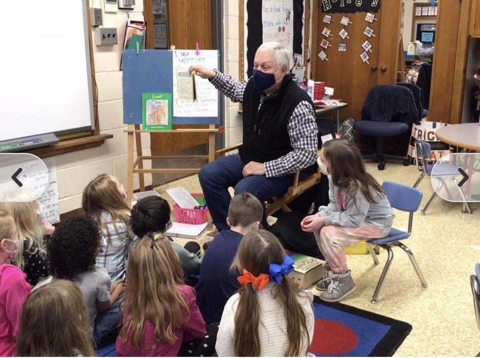 This is me reading in my granddaughter’s class, a year ago or so. I am holding “Chicken Soup With Rice.” By my feet is a large dictionary. I told the class that I was going to read the entire book, and hoped they were comfortable because it was going to take a long while. Their eyes got bigger than the book.