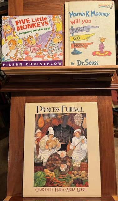 These are three books that I enjoyed reading to my kids and grandkids. These were their choices to read. The first is “Five Little Monkeys Jumping on the Bed”, by Eileen Christelow, 2004. The grandkids all wanted it. The next is “Marven K. Mooney, Will You Please go Home” by Dr. Seuss. A favorite of my son’s choices to hear. The third is “Princess Furball” by Charlotte Huck, 1989. My daughter loves this book. My mom did too. She wrote a Master’s theses in literature using variants of the Cinderella story, this being one.