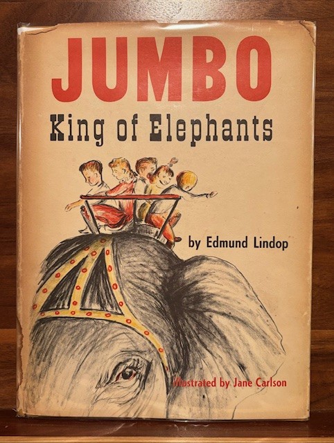 “Jumbo-King of Elephants” by Edmund Lindop, signed, 1960, is second of Lindop books I have (Herbert the Traveling Hippopotamus the other). This is a children’s book on the Story of Jumbo. He was born in Africa, caught as a small elephant and put in a zoo in Paris. He was so small, that he was traded to the London Zoo for an adult rhinoceros. He then grew to over 13,000 pounds, and was a wonderful attraction to the zoo. P.T. Barnum offered the zoo $10,000 for Jumbo, and they accepted. P.T. Barnum then brought Jumbo to America to his zoo, then toured with his circus.