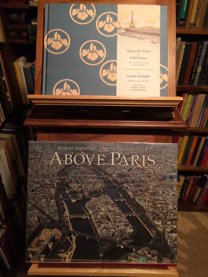 The first book “Above Paris” by Robert Cameron and Pierre Salinger,1985, is an amazing oversized collection of aerial photographs. These were made by helicopter, with special permission to be in Paris airspace (long before drones). The first page is a dizzying view alongside the top of the Eiffel Tower looking down.
