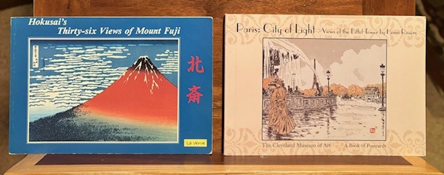 I threw in this picture of two books I have. “Thirty-six Views of Mount Fuji” by Hokusai, 1992, and “Paris: City of Light (Thirty-six views of the Eiffel Tower)” by Henri Riviere, 1998 because of their similar numbers, and because they were both books of postcards, printed for various museums.