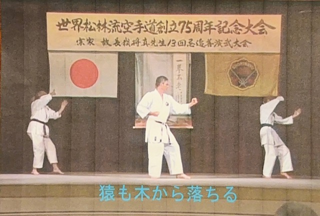 In any event, There he was in Okinawa, teaching with his students. The phrase “Even Monkeys Fall From Trees” is evident in the picture. Much like a monkey who may make a mistake and fall to the ground, my brother made a mistake in a kata move. His arms were not matched up with his students (who were doing it right.)