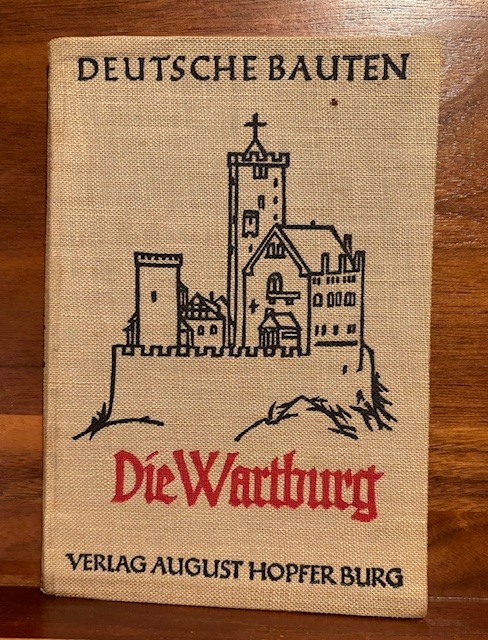 “Die Wartburg” published by August Hopfer, 1925, is a German language book about the Wartburg castle. It is one of a series of books, several I have on various castles and churches I have visited in Germany. The Wartburg is a beautiful and historic Castle near Eisenach, Germany. During this visit, we walked up a long trail to get to the mountain top, and took a self guided tour, after warm lunch looking over the countryside, watching the snow fall. Part of Wartburg’s long history, is this is where Martin Luther hid from the Pope, and translated the bible into German.