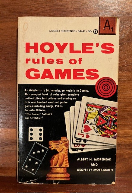 Of course one should own “Hoyles Rules of Games” by Albert H. Morehead and Geoffrey Mott-Smith, 1961. All types of games have their rules explained, not just card games. I have had to break out this book several times to settle differences.