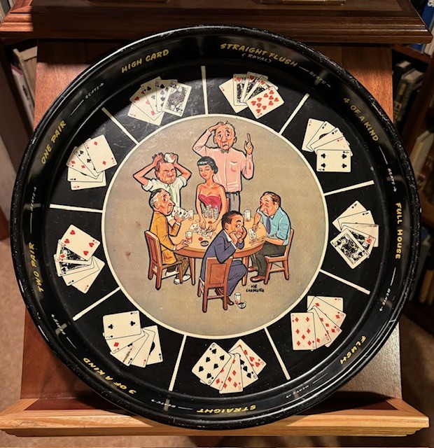 In college, where I really learned how to play, cards, we had this serving tray that we left on table for people to remember the order of different hands. We played for nickles, dimes, and drinks. Our group of card playing classmates are still our group of “mates”, over forty years later.