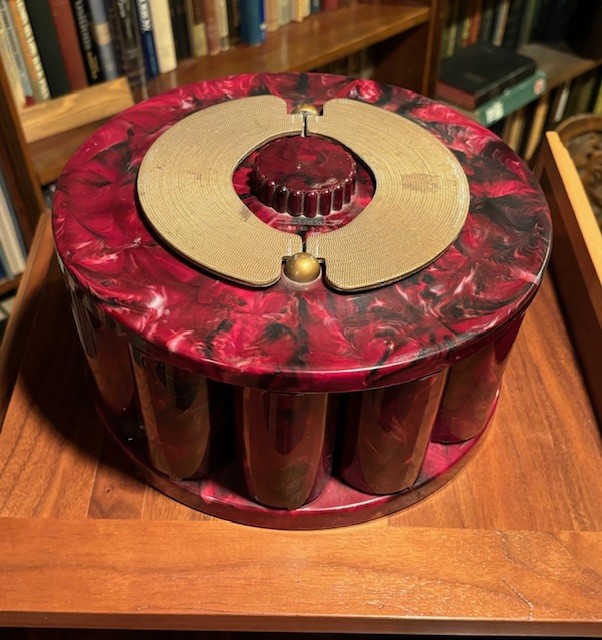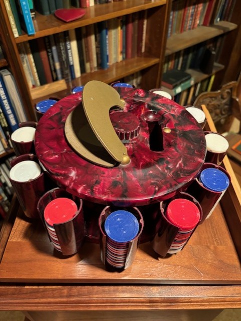 One day before a game, a great friend of mine stopped in with this. Said he just found it and thought of me. It is made by Turnit Manufacturing in 1950’s. Spin the knob and the chip holders swing out. Cards were stored under the handles .