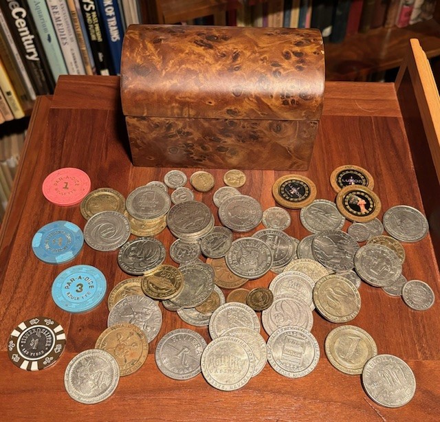 I have a box of chips and slot machine coins from various casinos that I have visited through the years. It is a shame now that gambling machines have been automated now. You get the sound of winnings, but gone are the buckets of coins you could win.