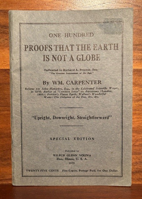 The book “One Hundred Proofs that the Earth is not a Globe” by William Carpenter, 1929 was published by Wilber Glen Voliva, Zion Illinois. It gives one hundred reasons to claim that the Earth is indeed flat. And it is a book with history of my hometown.