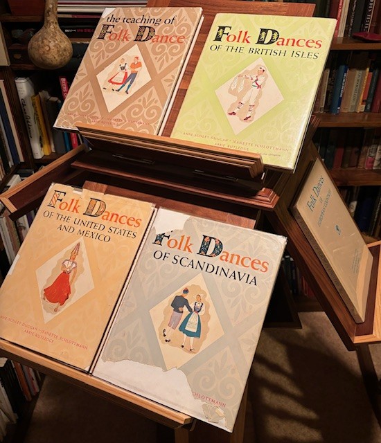 I also have a five volume set of folk dancing. “The Teaching of Folk Dance”, “Folk Dances of the British Isles”, “Folk Dances of the United States and Mexico”, “Folk Dances of Scandinavia”and “Folk Dances of European Countries”, all published in 1948. These are all colorful and entertaining books. There is background information for each country and types of dancing, then directions and tips for dancing, even some party ideas.