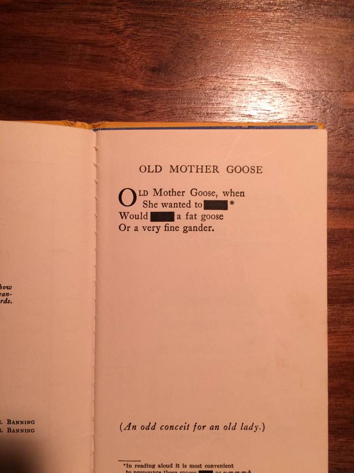 Should I discuss the other Mother Goose book? Ah…what the h@ll, but children may be reading, so I’ll clean it up. From 1929, “The Censored Mother Goose”. It is dedicated to the censors, “who have taught us how to read naughty meanings in to harmless words.”