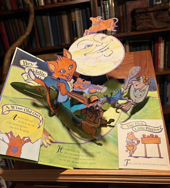 I have this delightful book “A Pop-up Book of Nursery Rhymes” by Matthew Reinhart, published 2009. Reinhart is one of the premier pop-up book paper engineers in the country. This book shows wonderful detail and whimsy. I am blessed to have my mom’s pop-up book collection now incorporated into my library. When I want to force a break from phones and I-pads, I tell the grandkids that we have to each have to pick one pop-up to go through. It works every time. Keep reading.