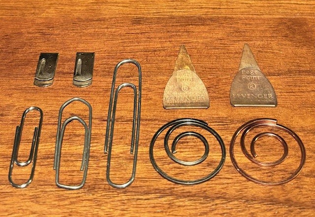 These are a few of the paperclips in my desk. The clip in the middle (our standard clip) is the Gem Paper-Fastener.