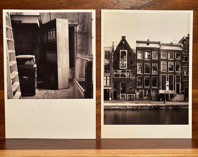 This is a postcard of the secret passage and bookcase door. The other postcard is of the house. Anne Frank and her family lived on the top several floors in the back of the triangle-shaped roof building. I walked through that hidden passage behind the bookcase. I saw where Anne slept, pinned pictures on the wall, where her family and a few others secretly lived for twenty five months, where she wrote her diary. I walked through the rest of the museum that went through her history before and after living in those hidden rooms.