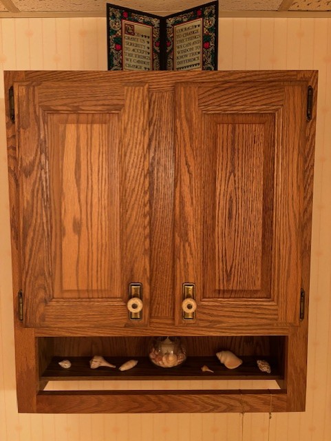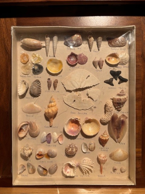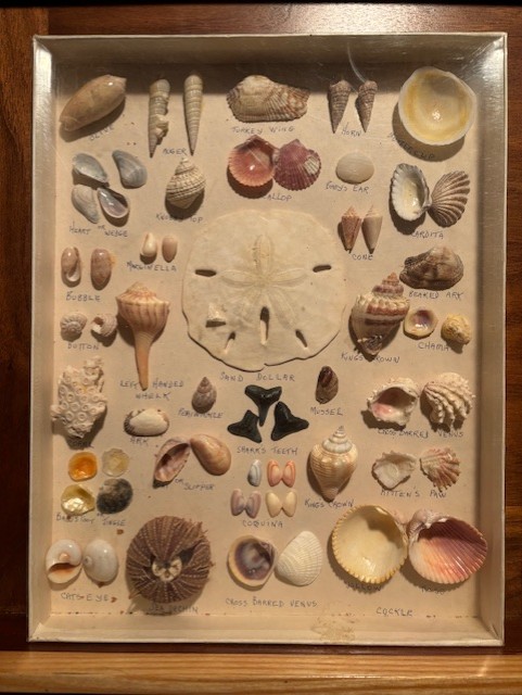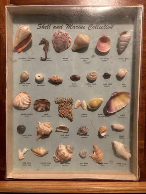 How about shells in cabinet over the toilet. There’s a couple Whelks, an Olive, a Conch, a Nutmeg and a Bubble.