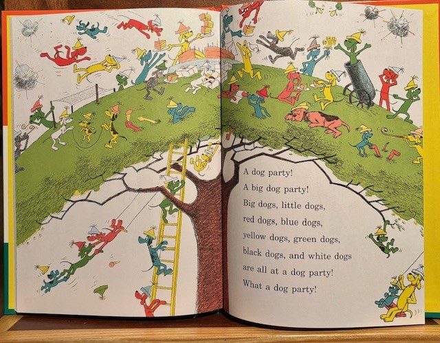 Why to a dog party, of course. I have read this perhaps a million times to my kids and grandkids. This is a perfect entrance for young minds to the library. As they say, “who’s ready to paw-ty.