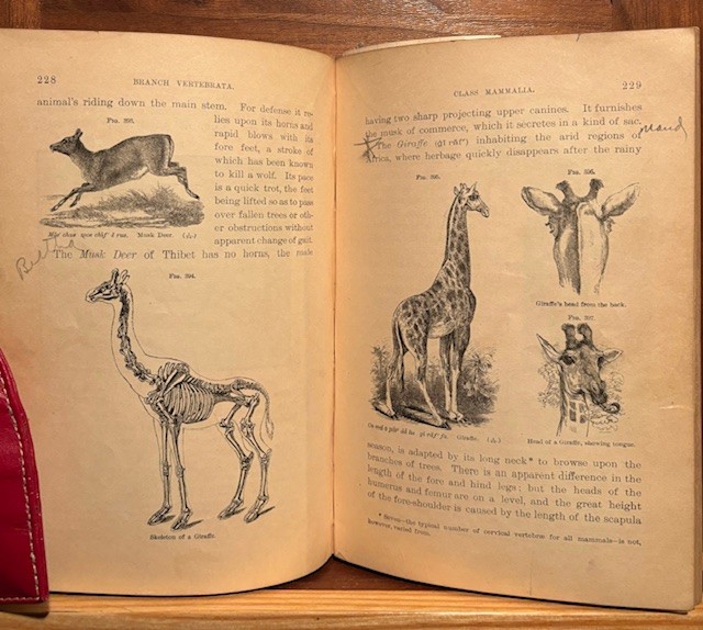This is a great old textbook that was used before 1900. There were several kids signatures, along with some children’s doodles throughout. It also is an interesting book to read. There were several pages about giraffes. One interesting note was that giraffes have the same number of vertebrae as other mammels, they are just much longer, may be up to 11 inches thick. Giraffes can grow up to 18 feet, but most only have four. (hah!) What do giraffes have that no one else has? Baby giraffes.