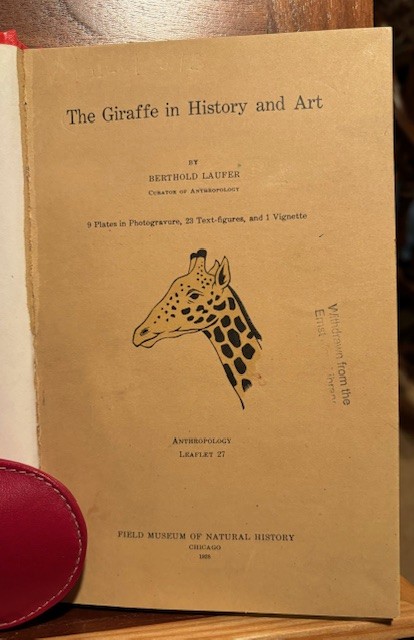 June 21st is also World Giraffe Day. My daughter loves giraffes. I have a couple of books for her. The first is a discard from the Harvard University of the Museum of Comparative Zoology,, (bookplate on the paste-down end paper), “The Giraffe in History and Art”, by Berthold Laufer, 1928. It is a pamphlet that the library hardbound. It was published by the Field Museum in Chicago. I don’t know why it was discarded-it is a very interesting book, and have thumbed through it several times.