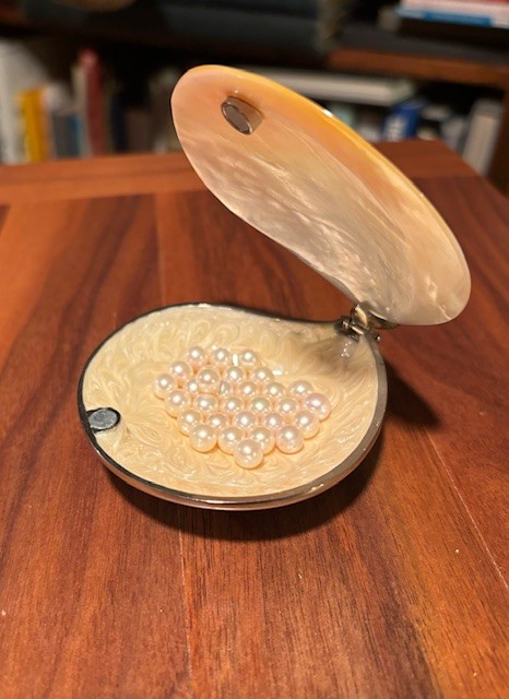I knew that she probably would allow me to keep the book in the library, so I also gave her a small trinket box in the shape of an oyster-with an actual mother-of-pearl lid. When she opened the shell, there were 30 un-drilled pearls, one for each year of our marriage.