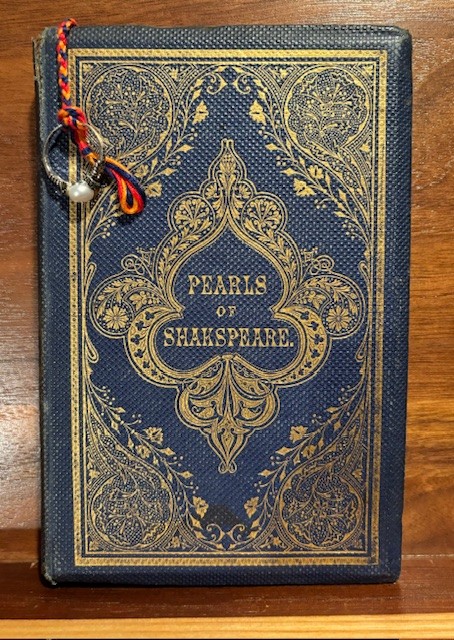 My last story is when my wife and I celebrated our 30th anniversary. I bought the book “Pearls of Shakespeare” published in 1860. It is in beautiful condition, and I made a bookmark with a pearl ring at the end. It was marked to a passage by Shakespeare: