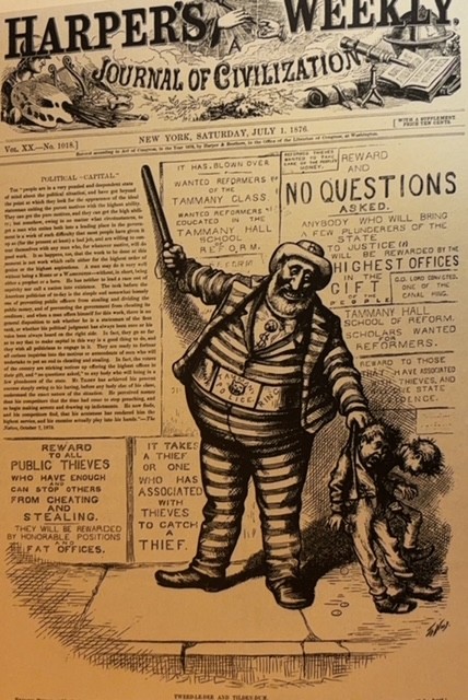 The first picture is of William Marcy Tweed, boss of Tammany Hall (Democratic corruption in New York). The illustrator was Thomas Nast, from Harper’s Weekly. He was offered $500,000 to quit and move to Europe, because Tweed said “my constituents can’t read. But damn it, they can see pictures.” Nast declined, and this picture got Tweed arrested.