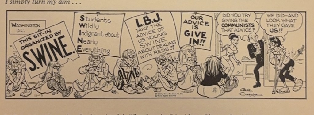 This illustration is by Al Capp. He said his job was to attack lunacy…wherever it is. This was against the Vietnam peace marchers, calling them S.W.I.N.E. Capp said “I attacked the Right for thirty years, and lunacy changed from Right to Left so I changed my aim.”