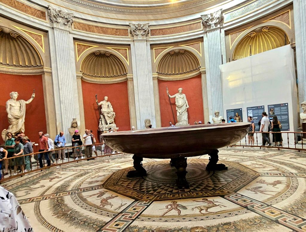 We also walked through the Round Room, or the Rotunda Hall. The ceiling is modeled after the Pantheon. The floor is a crazy mosaic from an ancient Roman bathhouse. There are statues of gods and emperors around the walls. And the centerpiece is a large bathtub. It is a ‘porphyry basin’ made for the Roman emperor Nero. It is the largest marble basin ever made, and it is an unusual purple marble, weighing over 1000 pounds. It is said to be worth $2,000,000,000 (two billion dollars).