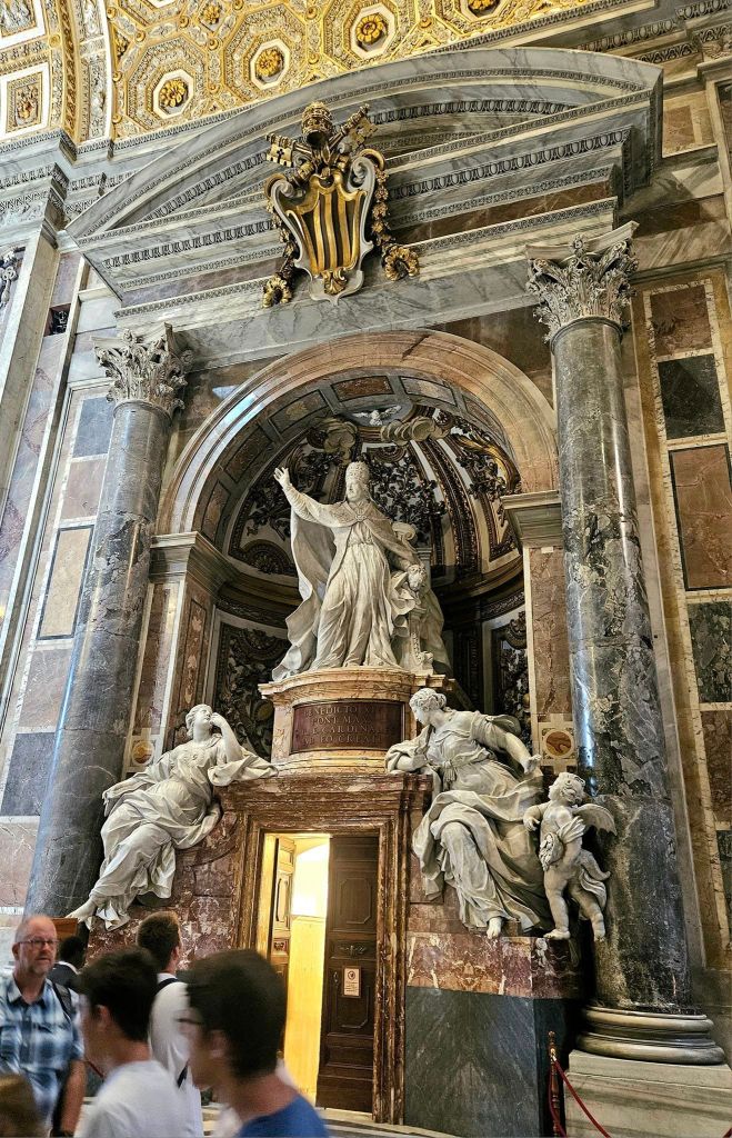 Once in St Peter’s Basilica, one of the first alters we saw was the one for Pope Benedict XIV. He is standing up with arm outstreached to give his blessing. On his right is the statue of Sacred Wisdom (or Knowledge) and on the other side is statue of Disinterestedness. The first figure holds a book in her hand, and has a gilded sun on her breast. She is looking at pope Benedict XIV in admiration of the culture of learning he brought. The other is flanked by an angel who is vainly trying to offer a cornucopia filled with jewels and money. She is spurning riches.