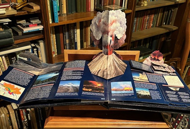 It had a great section about volcanoes, even a pop-up that had a billowing cloud of ash that moved skyward when the book was opened. An interesting fact was that when you turned the book backward, there was a diagram of the volcano, and several pargraphs describing it that were printed upside down, so when you were looking at the backside, you could read the paragraphs. An interesting detail.