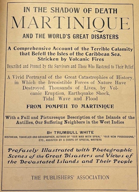 I then turned to an old volcano book “In the Shadow of Death: Martinique and the World’s Great Disasters” by Trumbull White, published 1902. Let me first give you a picture of the cover page. It is quite a title.
