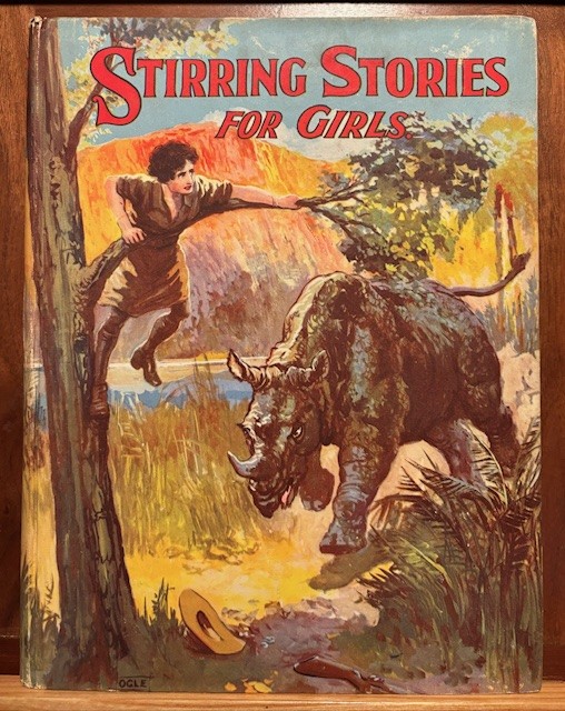 September 22nd is World Rhino day. While you can’t always judge a book by its cover, this one is wonderful. I have showed it before, and it is worth a second look. This is “Stirring Stories for Girls” by John F. Shaw & Co. circa 1930. I have seen this book of stories with other cover art, but this is only time with a Rhinoceros. The action of a charging Rhino, and the girl jumping up the tree is great. In the book, the illustration is titled “in the nick of time”.