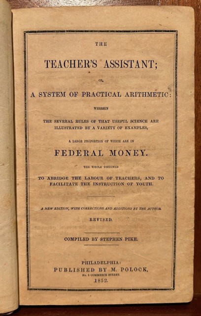 My next teaching book is a little newer, “The Teacher’s Assistant or A system of paractical Arithmetic” by Steven Pike, published in 1852. This book begins with simple addition, and then into banking math of compounding interest, and then Geometry.