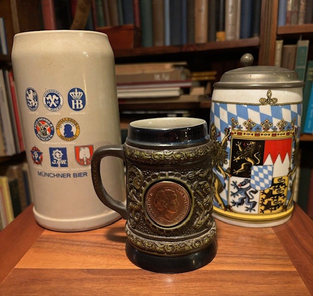 The first Octoberfest was October 12, 1810. The festival was held to celebrate the marriage of Crown Prince Ludwig of Bavaria and Princess Therese von Sachsen-Hildburghausen. Have a few steins from my first visit to Germany. The left stein is all of the beers made in Munich-home of the Octoberfest. The center is a stein commemorating Prince Ludwig of Bavaria (and Neuschwanstein Schloss-the fairytale castle), and the third is a stein with the coat of arms of Bavaria.