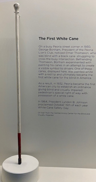 October 15th is White Cane Safety Day. In our local museum in Peoria, we have a cane that now is representitive of the official white and red colored cane for the blind. It was the first one, and is on display as you walk into the museum.