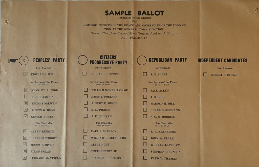 I found this sample ballet lining an old jarring cabinet of my mom’s. This was from 1941. My great grandfather running for Assessor in Zion, Ill.