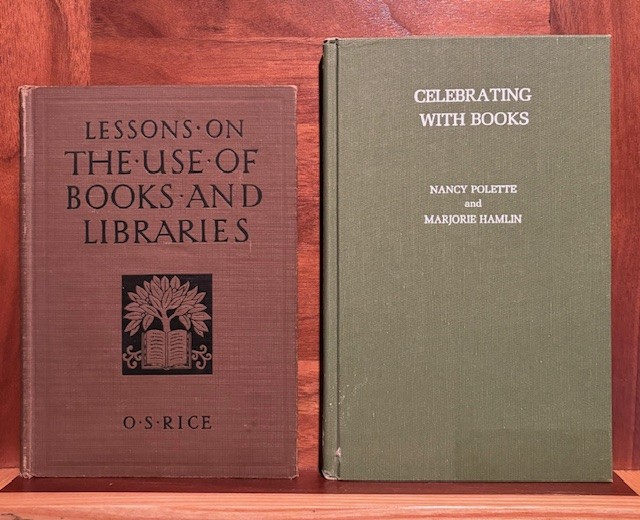 I have a few books on libraries to help sell this program. “Lessons On the Use of Books and Libraries” by O.S. Rice, 1930, and “Celebrating With Books” by Nancy Polette and Marjorie Hamlin, 1977.
