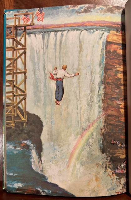The book has four stories, the last one called “Sam Patch’s Last Leap. The book goes into the history of Sam Patch, and then his fateful last jump. Sam was the first person to jump off of the Horseshoe Falls at Niagara in 1929. Here is one illustration of Sam Patch jumping.