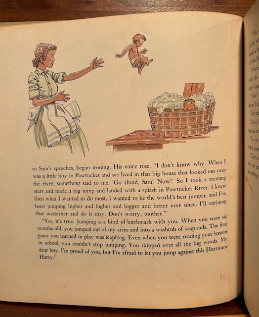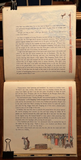 Another great illustration is when the authors wanted to show how tall a ladder was that Sam Patch was climbing. The two pages were printed sideways, so you had to move the book over, and read down as Sam Patch was climbing up the ladder. Quite a dramatic look when you turn to those pages and have to read the book differently. A smooth and effective printing choice.