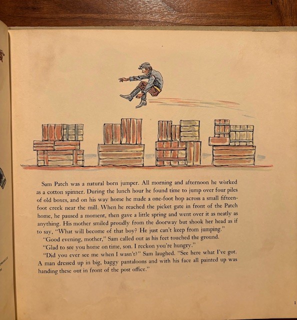 I have another interesting book called “Sam Patch” by Arna Bontemps and Jack Conroy, published 1958. The full title is “Sam Patch the High and Wide Hansome Jumper”.