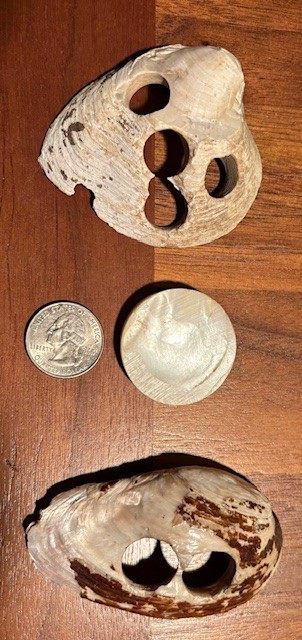 I have also since March, found a few shells that have had button blanks drilled out of them to then be polished and made into pearl buttons.
