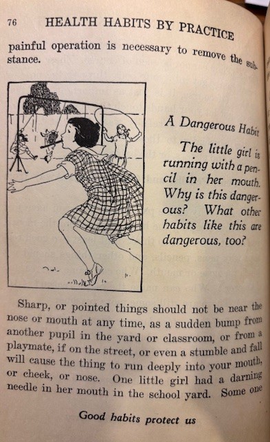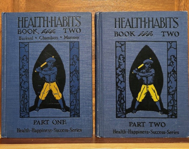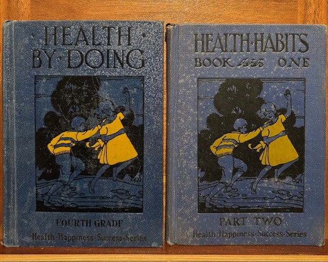 I have a bunch of school textbooks on Health from the 1920’s and 1930’s. They are part of my larger collection of reading, writing, and ‘rithmatic textbooks. Several of these six textbook series, look brand new (like the boy jumping in leaf pile).