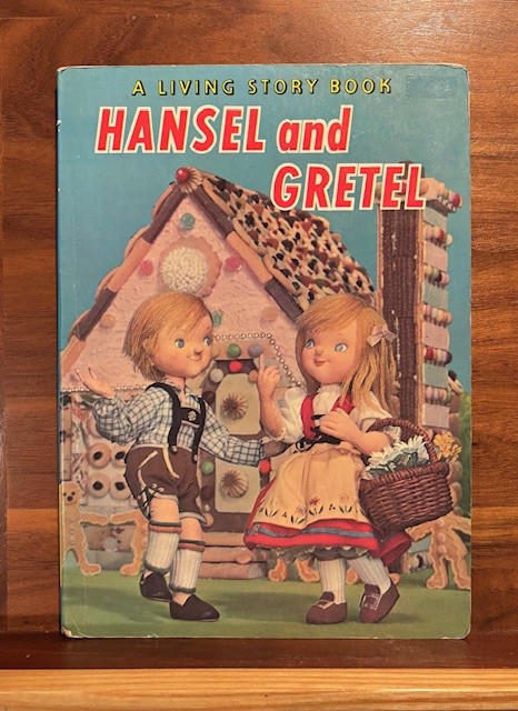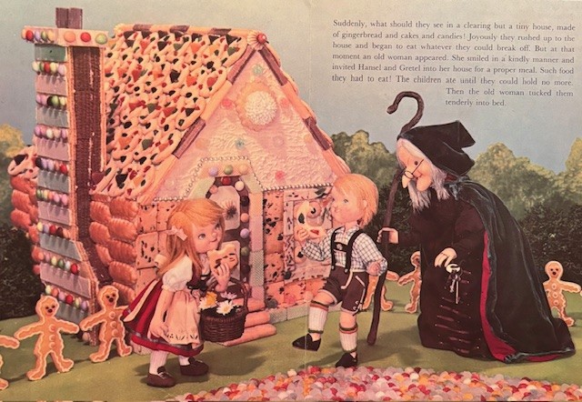 I also have two other interesting books about Hansel and Gretel. They are both illustrated by dolls posed as the characters in the story. The first book is “Hansel and Gretel” “A Living Story Book” published in 1967. I would like to show the book, and then the kids eating pieces of the house.